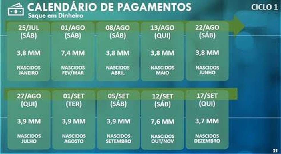Em todo o país, 717 agências estarão abertas. De acordo com a Caixa, a partir deste sábado, 7,4 milhões de beneficiários nascidos em fevereiro e março poderão sacar o benefício nos caixas eletrônicos, lotéricas e correspondentes Caixa Aqui, além de transferir valores para contas da Caixa ou de outros bancos, de acordo com o Ciclo 1 do calendário de pagamentos (veja abaixo).