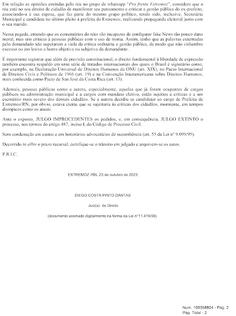 O Juiz da Comarca de Extremoz, Dr. Diego Costa Pinto Dantas julgou improcedente uma ação movida pela ex-candidata a prefeita do município, Renata Costa de Brito Torquato Rêgo, contra o digital influencer, Rubivaldo Torres “Valdo” que utiliza as redes sociais para manifestar sua opinião política, sobretudo em relação à administração pública municipal e diversos assuntos pertinentes.